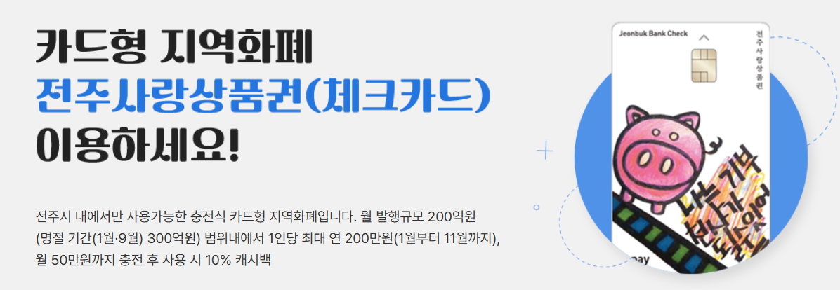 전주시가 발행하는 충전식 카드형 지역화폐로, 소상공인 및 전통시장 활성화와 지역 자금의 역외유출 방지를 위해 도입되었습니다.